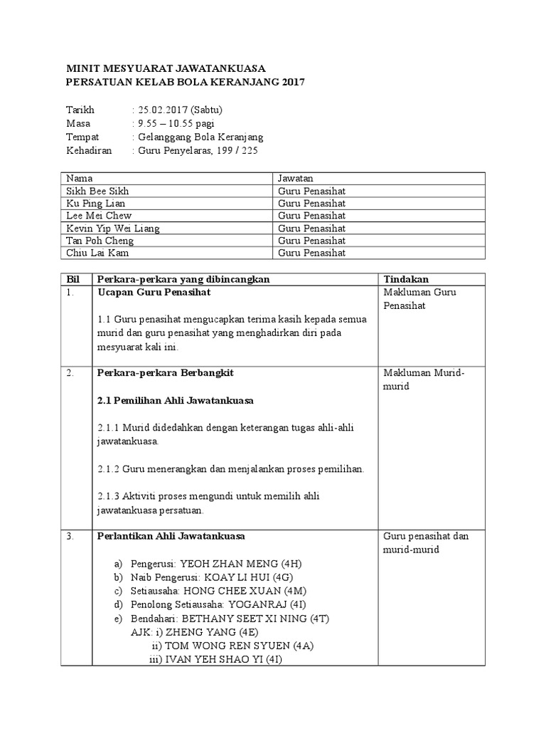 Minit mesyuarat kokurikulum kali pertama kk by Evelyn Alex ... from image.isu.pub Minit mesyuarat kebiasaanya mengandungi perincian hal yang telah dibincangkan dalam salah satu kepentingan minit mesyuarat adalah sebagai bukti pertemuan atau perbincangan antara dua pihak. ( ) setiausaha tarikh : Savesave format minit mesyuarat terkini pkpa 2_1991 for later. Dan yang paling penting ia mesti mengikut format terbaru mesyuarat yang. Pengesahan minit mesyuarat catatan keputusan minit mesyuarat yang lepas iaitu sama ada disahkan tanpa pindaan atau disahkan tertakluk untuk memudahkan rujukan dibuat, muka surat dan perenggan minit mesyuarat yang lepas yang membincangkan perkara yang sama hendaklah. Jika tiada catatan, segala perbincangan tidak akan ada tindakan susulan. Senarai contoh minit mesyuarat terkini : Format penulisan minit mesyuarat pengenalan 1.
