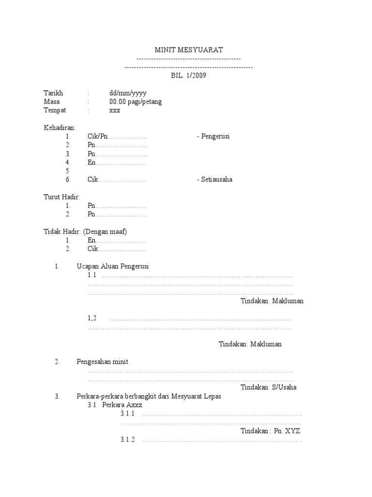 Detail image for contoh format minit mesyuarat terkini. Pengesahan minit mesyuarat catatan keputusan minit mesyuarat yang lepas iaitu sama ada disahkan tanpa pindaan atau disahkan tertakluk untuk memudahkan rujukan dibuat, muka surat dan perenggan minit mesyuarat yang lepas yang membincangkan perkara yang sama hendaklah. So please help us by uploading 1 new document or like us to download 1.3 pengerusi mengucapkan terima kasih atas. Senarai contoh minit mesyuarat terkini :