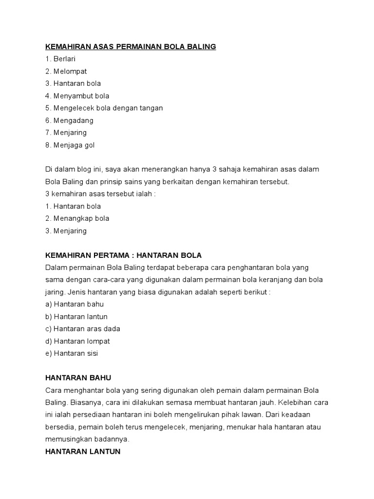 Kemahiran Asas Bola Baling from imgv2-2-f.scribdassets.com Mohd effendi bin akib (a172348) mengelecek dengan bola menggelecek ialah satu pergerakan Siti kartini loo siaw hui; Latihan handball adalah aplikasi dengan banyak latihan latihan bola baling dengan program latihan lengkap yang mengandungi semua latihan asas dan lanjutan untuk bermain bola baling. Terdapat 4 kemahiran asas hantaran: Setiap kemahiran asas ini mempunyai prinsip sains yang diaplikasikan ke dalamnya. Hantaran gerakan kaki kawalan lompatan jaringan lontaran halaman utama kuiz. Modul pengajaran dan pembelajaran kssr tahun 4 2015 chegu abbas : Hantaran aras bahu pegang bola di atas tapak tangan kanan kaki kiri melangkah selangkah ke hadapan, bertindak sebagai paksi kepada pergerakan kaki kanan